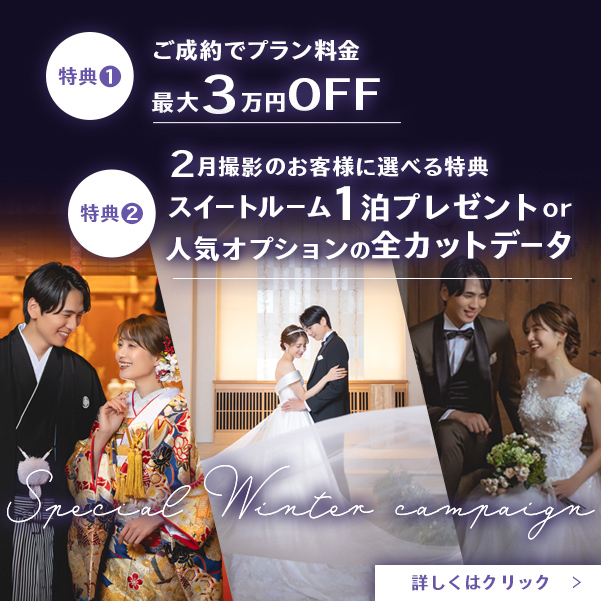 雨や曇りなど天候を気にする必要がなく、暑さでメイクが崩れたり、強風で髪が乱れる心配もありません。スタッフが常にあなたを完璧な状態に整えます。 また、スタジオがホテル内にあるため、衣裳やメイクチェンジなどの移動も最小限で済み、ご親族の方も安心してご見学いただけます。